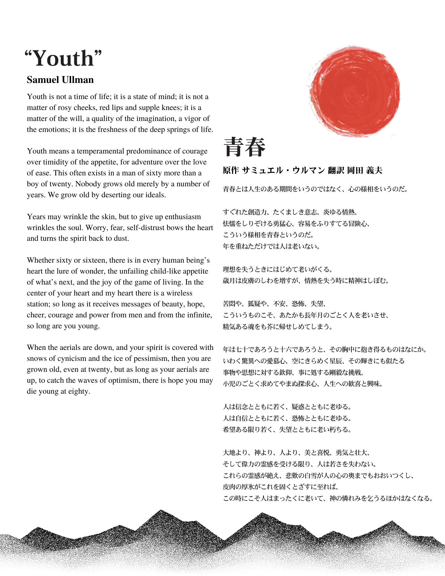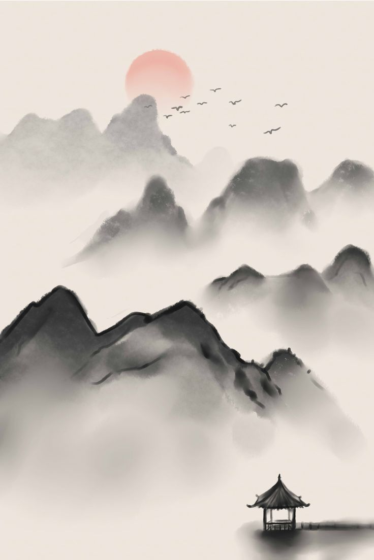 My initial thought when given the project was to incorporate a Japanese art style. After researching, I fell in love with the ink art native to Japan and the natural elements, such as water, mountains, and trees, that it featured. I made a list of elements that I wanted to include in the design, which were mountains, trees, and a red sun as an accent, and began creating some drafts.