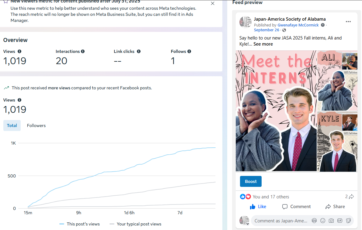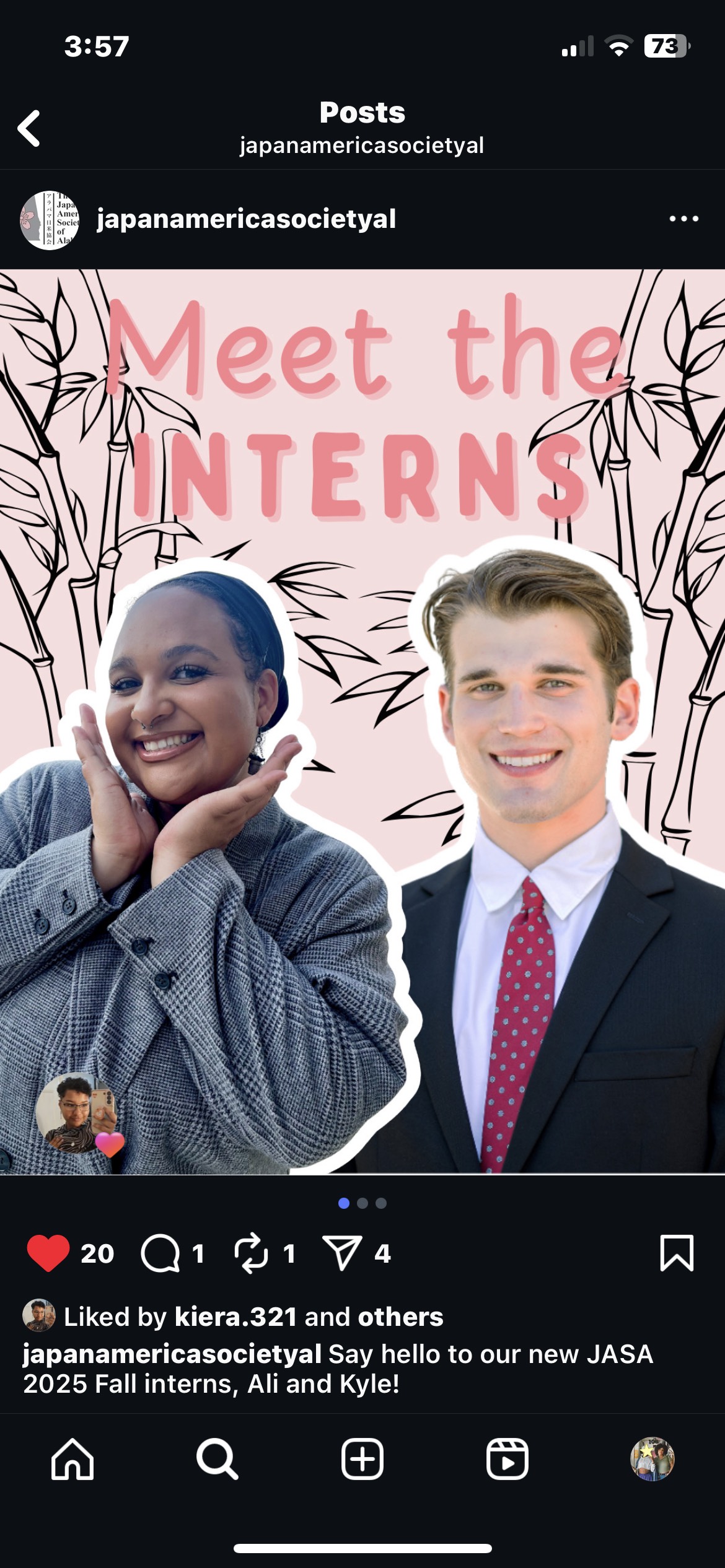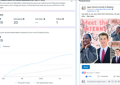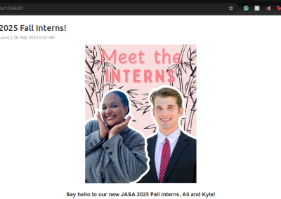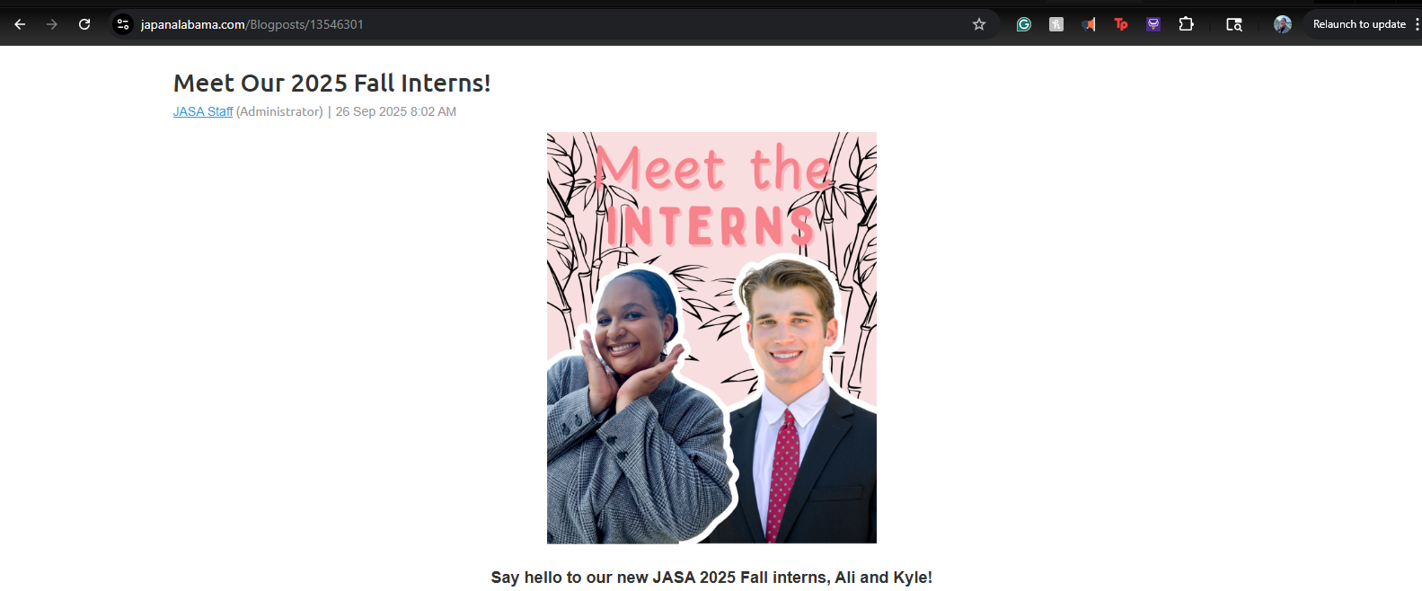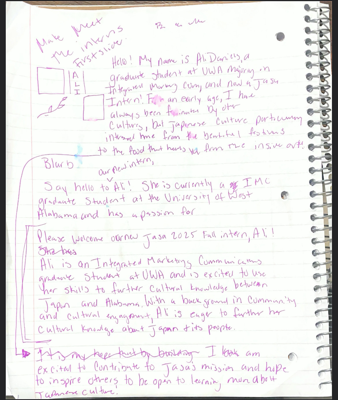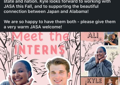 The Japan-America Society of Alabama (JASA) selects 1-2 interns in the Fall and Spring semesters. I was given the opportunity to become one of two interns in the Fall of 2025. My first assignment was to create ‘Intern Profiles’ to be posted on all JASA’s social media, website, and Newsletter.