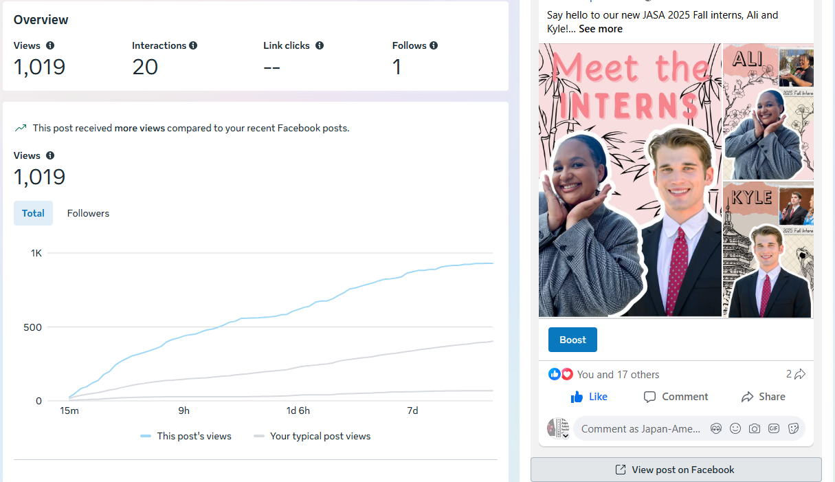 On Facebook, this post had a total of 1,019 viewers, compared to their usual 403. Additionally, there were a total of 20 interactions, comprising 18 likes and 2 shares. JASA was able to gain 1 new follower on this platform.