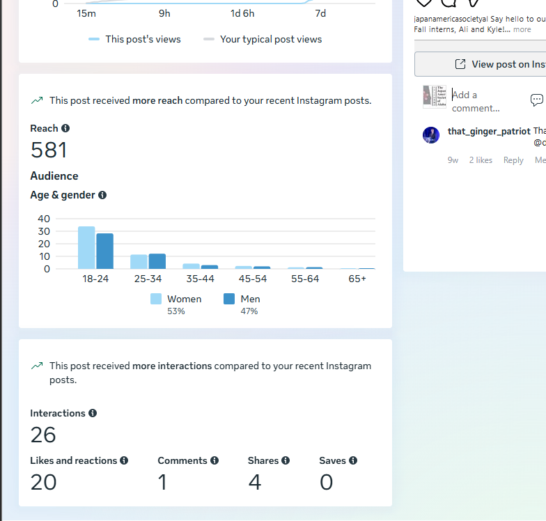 Instagram saw a significant increase in viewership, with 1,697 viewers compared to 453 regular viewers. This post received a total of 26 interactions, broken down as follows: 20 likes, 4 shares, and 1 comment.