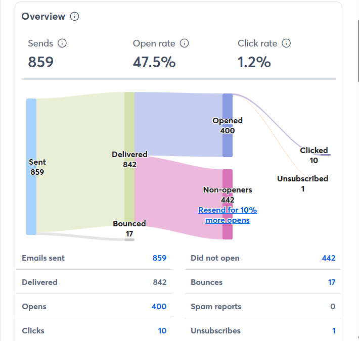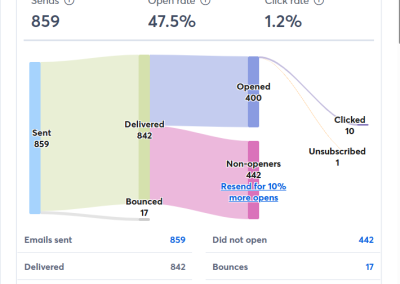 The newsletter sent this special edition email to a total of 859 people. The open rate of this email was 47.5%, compared to the usual 40% opening rate.